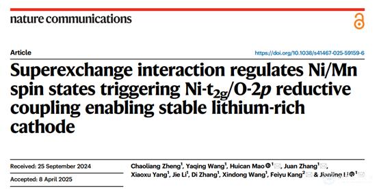 针对这一挑战,研究团队在《Superexchange interaction regulates Ni/Mn spin states triggering Ni-t2g/O-2p reductive coupling enabling stable lithium-rich cathode》中提出了一种通过超交换作用调控Ni/Mn自旋态的新机制。研究发现,Ni与Mn之间的超交换相互作用能够有效调节Ni的电子构型,触发Ni-t2g轨道与O-2p轨道的还原耦合,从而稳定晶格氧并抑制不可逆的氧流失。这种耦合作用不仅显著提升了材料的电荷补偿能力,还通过形成稳定的Ni-(O-O)构型缓解了循环过程中的结构畸变。实验表明,基于该机制设计的富锂正极材料在长循环中表现出优异的电压稳定性和容量保持率,其性能提升归因于超交换作用对过渡金属自旋态的精准调控以及由此引发的电子重分布效应。