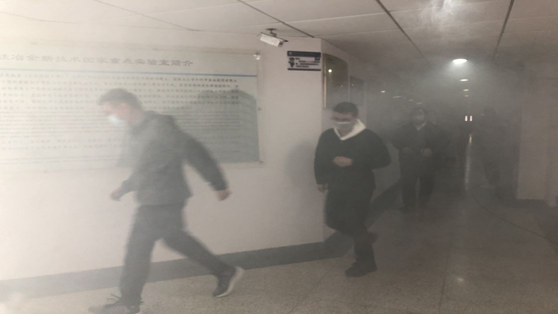 14:30各楼层疏散员和参加演习的工作人员于指定地点待命总指挥张百年宣布演习开始保卫处在十楼和一楼释放烟雾师生根据每个楼层疏散员的指挥井然有序地从各楼层疏散到一层大车间广场按照三个单位集合并清点人数。