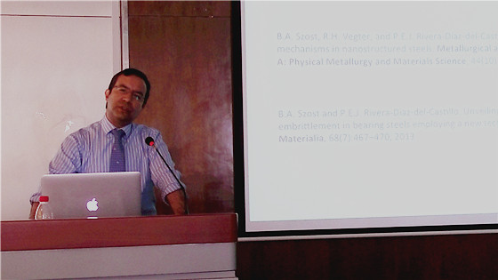 本次讲座题为“Fatigue in bearings: phenomenology and modelling ”,Pedro Rivera 博士对轴承钢的滚动接触疲劳强度与不同微观组织结构间的关系做了系统的阐述,建立了关于钢中位错对碳的传播影响的模型,并与在座师生分享了剑桥大学团队多年来在氢元素对钢品质的影响机理上的研究成果。