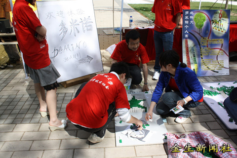 在我院的展位上,蔚蓝人文生态学社向大家展示了许多精美的物品,其原材料是回收的旧物,不禁让大家感叹――原来旧物回收可以如此文艺。学生会与金生新闻社则联手展开情侣做爱