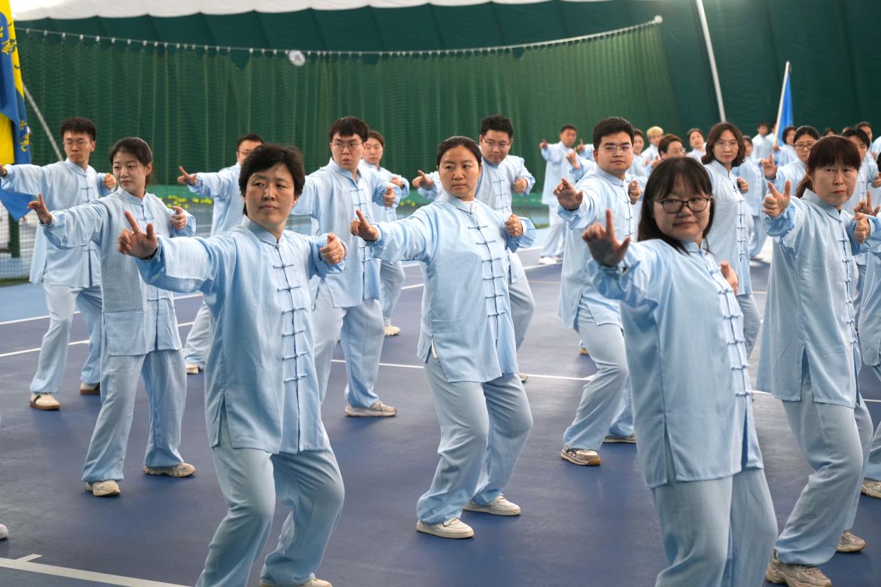 比赛现场,情侣做爱 代表队身着统一服装,精神饱满,动作舒展沉稳,较好地将八段锦柔缓连贯、形意相随的特点呈现出来,展现了情侣做爱 教职工积极健康、团结和谐的精神风貌。