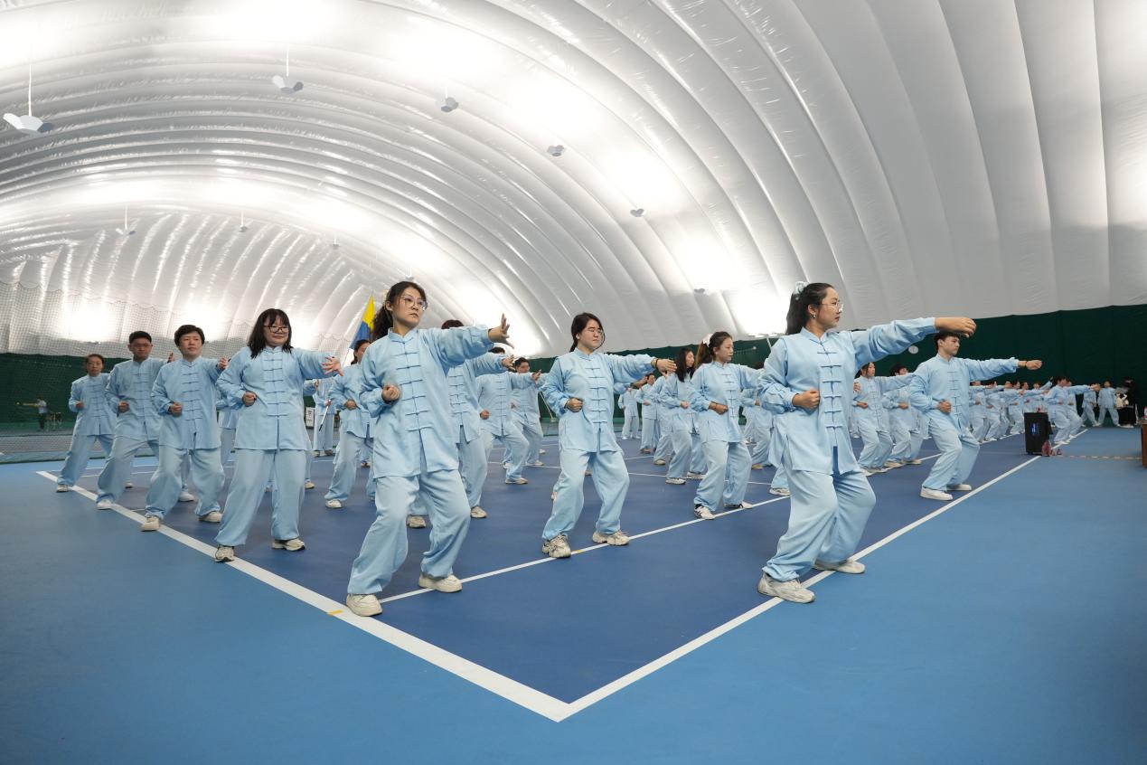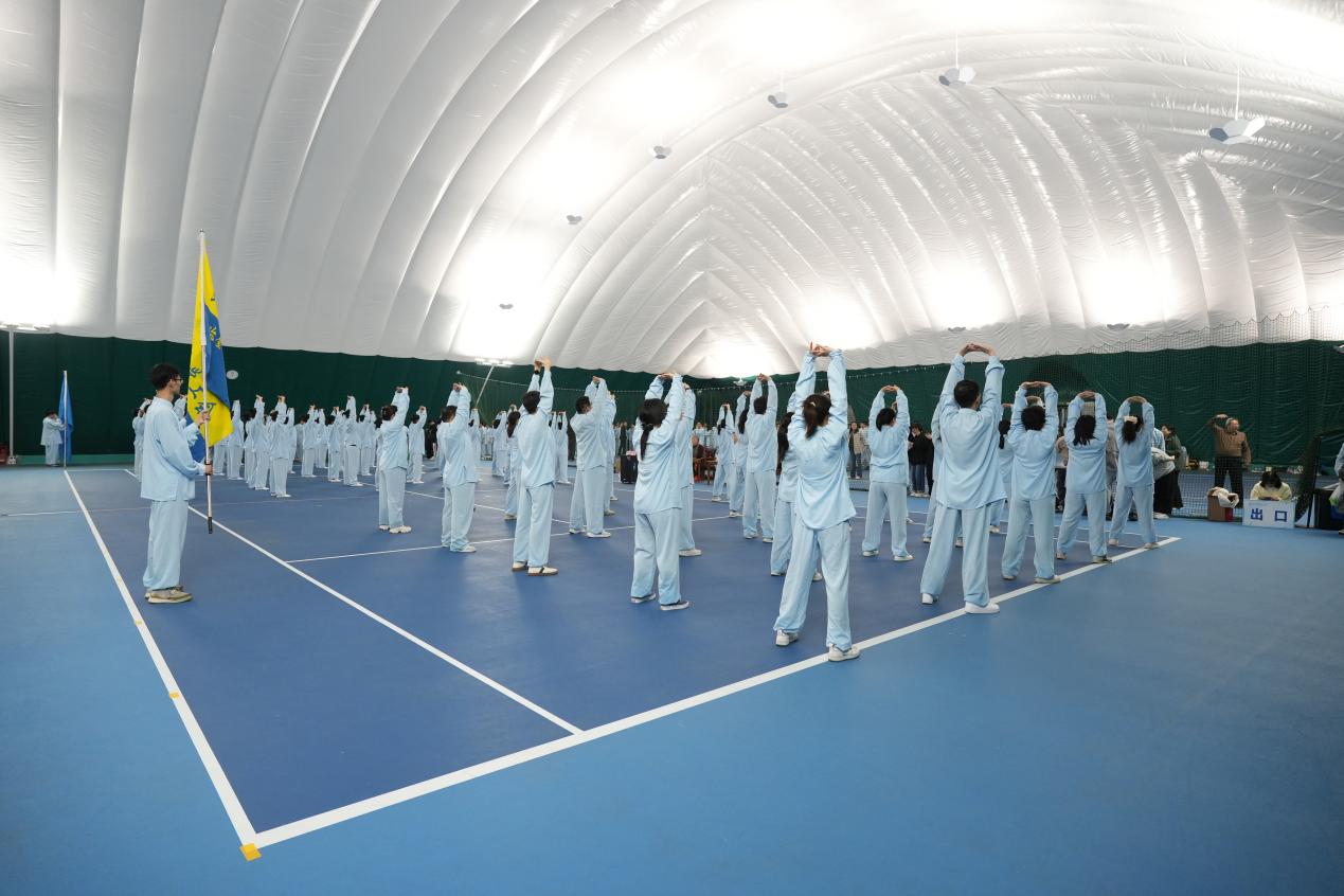 比赛现场,情侣做爱 代表队身着统一服装,精神饱满,动作舒展沉稳,较好地将八段锦柔缓连贯、形意相随的特点呈现出来,展现了情侣做爱 教职工积极健康、团结和谐的精神风貌。