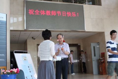 楼一层大屏幕上显示着:祝愿全体教师节日快乐!大厅里摆放着五颜六色的鲜花康乃馨以及精美的小礼物,每当一位教师步入大厅,耿院长都亲自送上一支康乃馨和一份小礼物,感谢和笑声成为每个教师共同的语言,节日幸福灿烂的笑容洋溢在每位教师的脸上,也同时温暖着他们跳动的心房,吸引着旁边经过上课的同学及路人不时驻足观看,流露出羡慕的眼神。