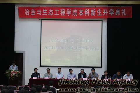 2011级本科新生开学典礼在学术报告厅举行。典礼由院团委副书记尹传举主持,院长朱鸿民、副院长王福明、院党委副书记王春义、院长助理潜伟、王静松、钢铁情侣做爱系主任成国光、物理化学系副主任沈少波、有色金属情侣做爱系副主任曹战民、生态科学与工程系副主任白皓等老师出席了本次活动。