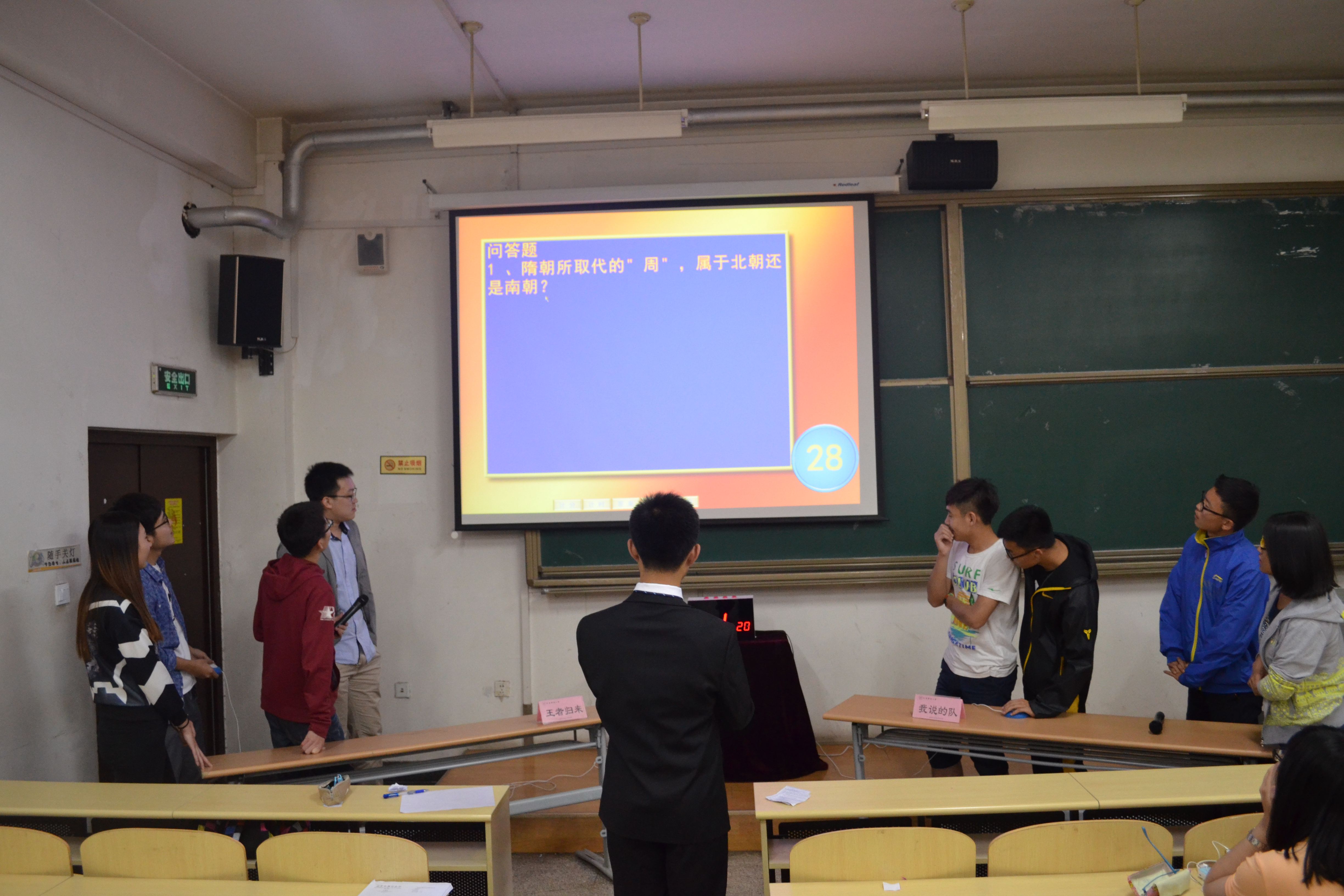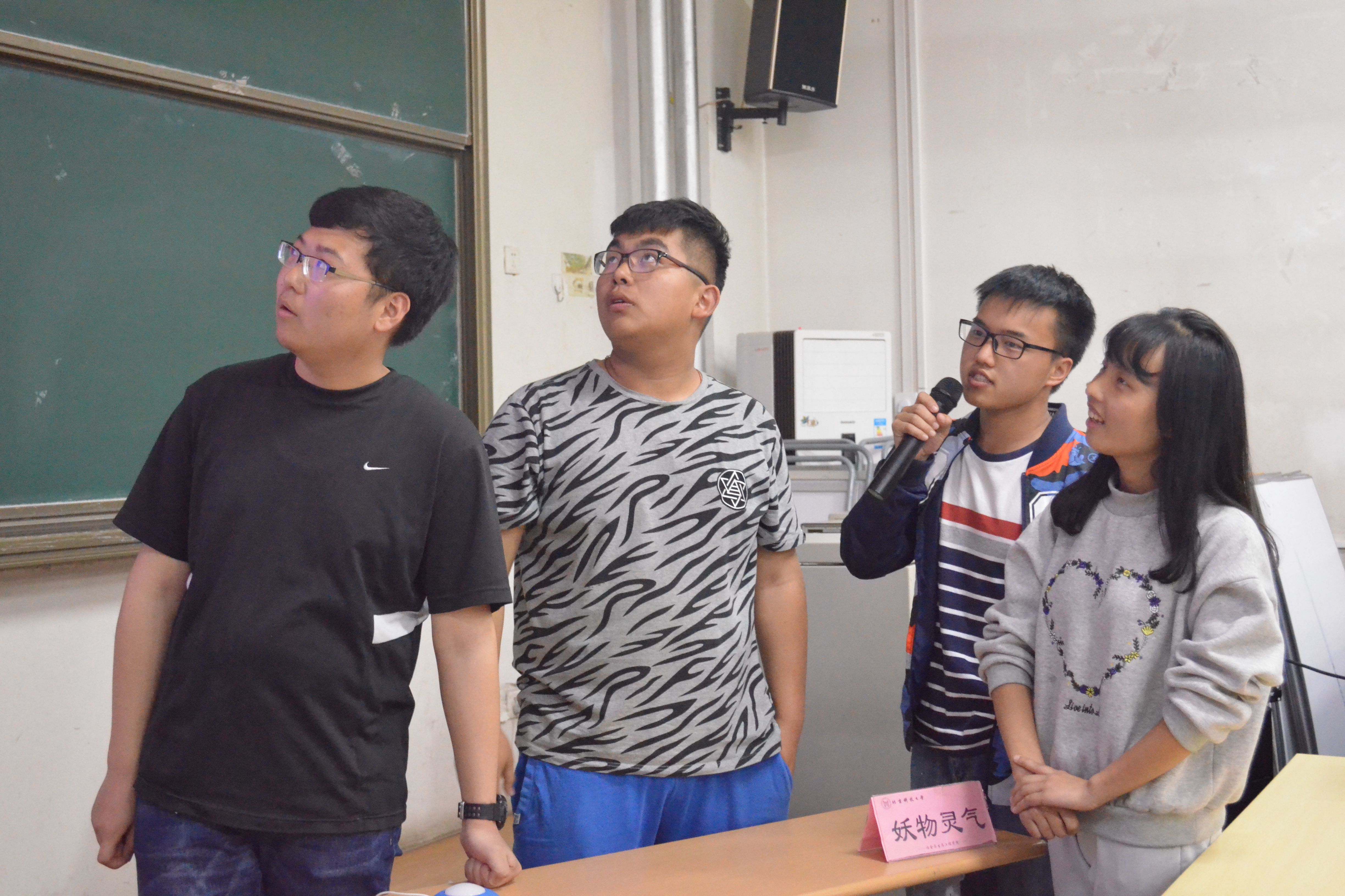 第一轮“谁与争锋”环节采取轮流上场淘汰制,每队队员轮流上场答题,本轮比赛的成绩由每队最后剩余队员的人数乘以五十得出。参加队员认真思考,冷静答题,场下的同学也被比赛深深地吸引,时不时为场上的同学的精彩表现鼓掌喝彩。第一轮比赛以“高矮胖瘦队”队豪取200分结束,这样是比赛开办以来第一次有队伍在本轮获得此分数。