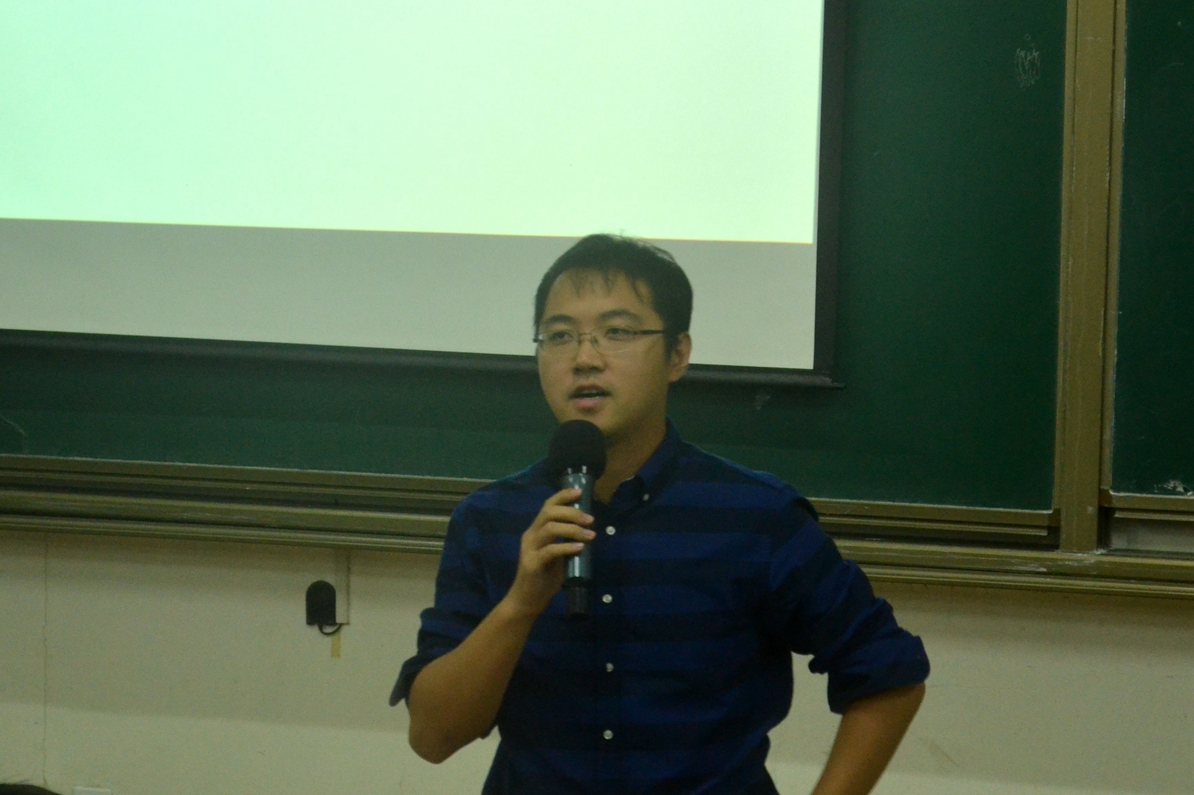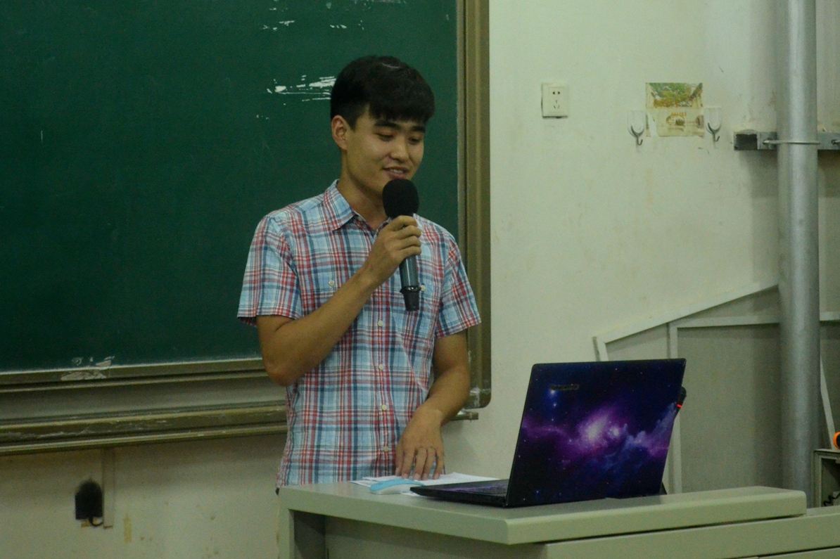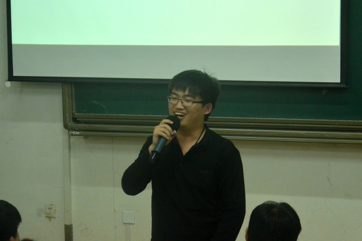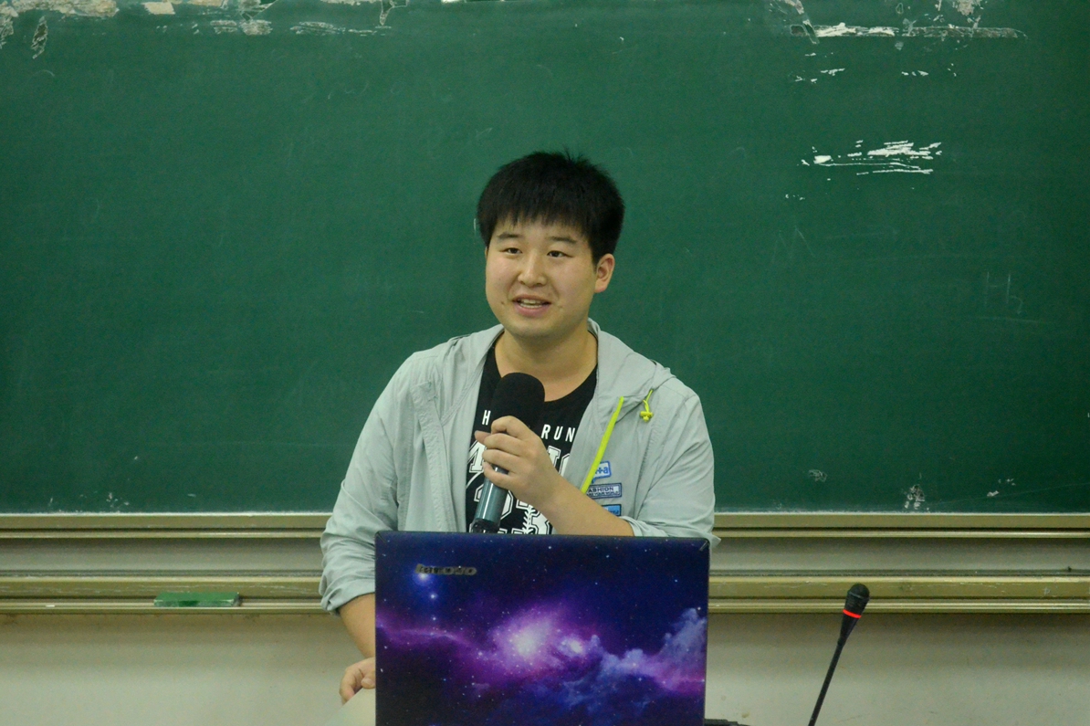 13级本科同学孙胜东首先向大家介绍了学业发展的相关内容,幽默风趣的PPT展示向同学们描绘了大学生的课业安排以及日常学习生活,紧接着给新生分享了他学习的经验,要有最初的梦想,良好的自制力和学习习惯,努力管理好自己的学习与生活。”他还讲述了参加科技竞赛的收获即“团队合作,创新意识,个人技能,学科交叉”。“求知若渴,大智若愚”是他对16级本科新生们的寄语。