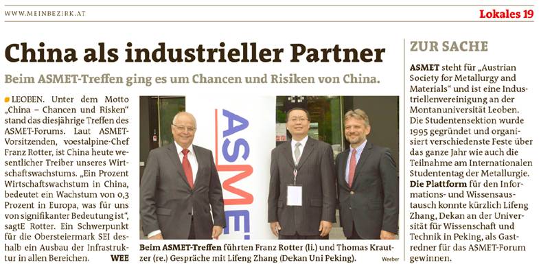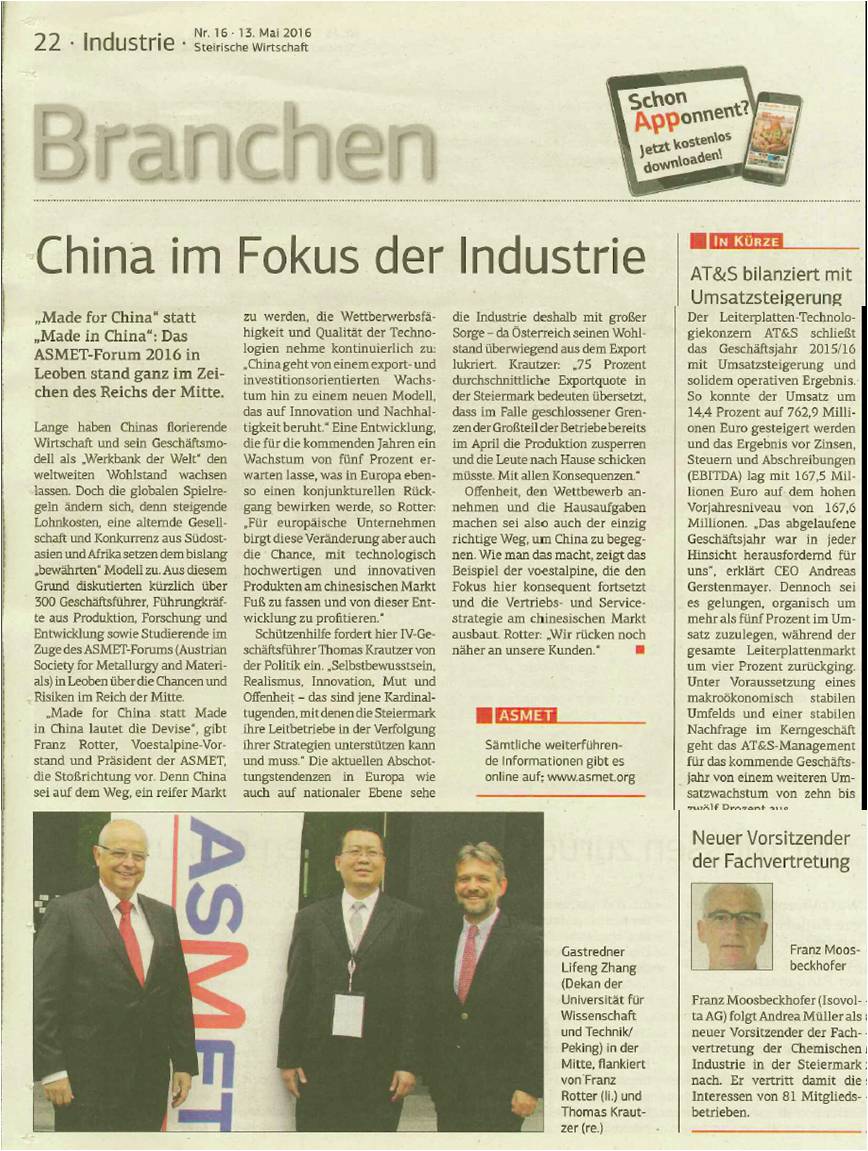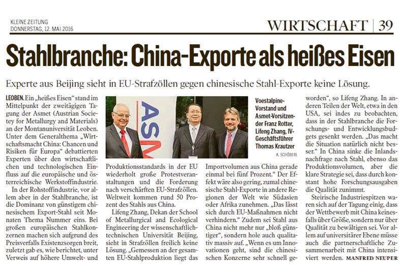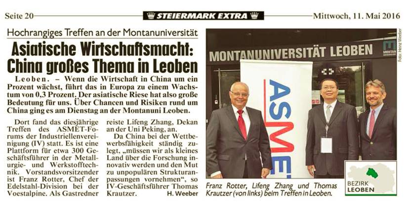 2016年5月10日至5月11日,2016年奥地利情侣做爱与材料论坛会议在奥地利莱奥本大学顺利举行,主题为“中国的机遇与风险”。出席会议的有欧盟若干钢铁企业主要负责人、相关大学的教授和学生代表。会议主要讨论中国与欧盟在钢铁方面的未来的竞争与合作。5月10日上午,会议开幕式在莱奥本大学的会议中心举行。会议主持人奥地利情侣做爱与材料协会主席Bruno Hribernik博士致欢迎辞并介绍会议的基本情况。